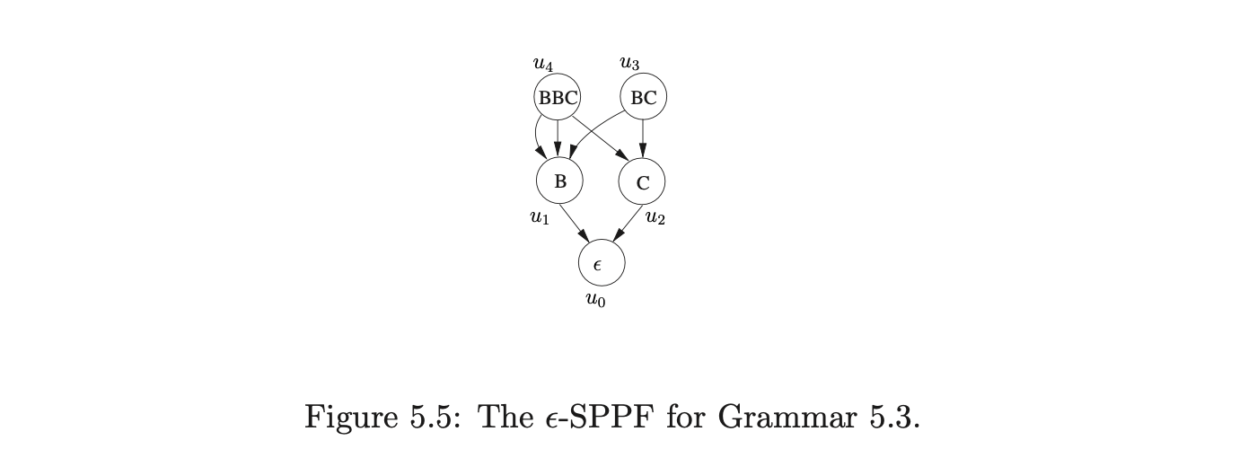 For example, consider Grammar 5.3. The nullable non-terminals are \(B\) and \(C\), and the required nullable parts are \(BBC\) and \(BC\). We define \(I(B)=1\), \(I(C)=2\), \(I(BC)=3\) and \(I(BBC)=4\). The associated \(\epsilon\)-SPPF is shown in Figure 5.5.